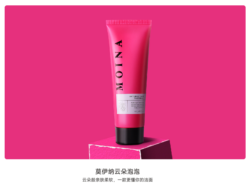 MOINA的品牌愿景:专注中国化妆品CS渠道,以澳洲进口,葡萄+科技的果养入肌护肤理念为核心差异,打造符合中国18-38岁热爱鲜果纯净护肤的年轻女性的护肤产品,品牌核心功效是紧致抗皱,让女性肌肤以果养入肌7*24H,时刻鲜嫩紧致。